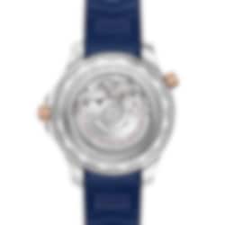 This 42 mm model is crafted from stainless steel and 18K Sedna™ gold, and includes a blue ceramic bezel with a Ceragold™ diving scale. The dial is also polished blue ceramic and features laser-engraved waves and a date window at 6 o’clock.