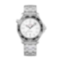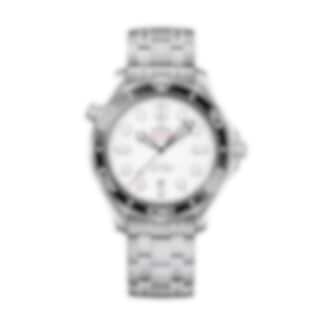 This 42 mm model is crafted from stainless steel and includes a black ceramic bezel with a white enamel diving scale. The dial is polished white ceramic and features laser-engraved waves and Seamaster highlighted in red.