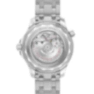 The watch is presented on a polished-brushed stainless steel bracelet and is driven by the OMEGA Master Chronometer Calibre 8800, which can be seen through the sapphire-crystal on the wave-edged caseback.