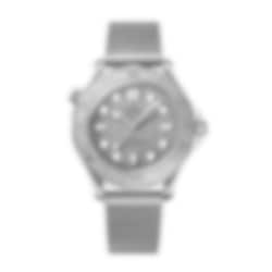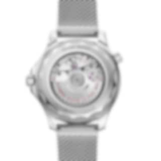 The watch is presented on a brushed mesh bracelet with clasp, and is driven by the OMEGA Co-Axial Master Chronometer Calibre 8806, which can be seen through the sapphire-crystal caseback.