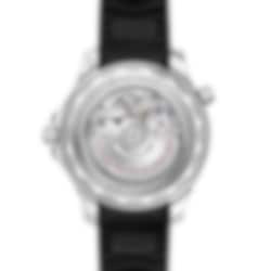 This 42 mm model is crafted from stainless steel and includes a black ceramic bezel with a white enamel diving scale. The dial is also polished black ceramic and features laser-engraved waves and a date window at 6 o’clock.