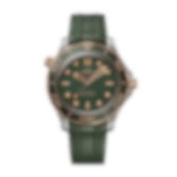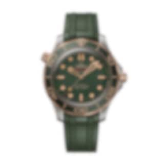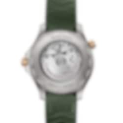 The watch is presented on an integrated green rubber strap with foldover clasp, and is driven by the OMEGA Co-Axial Master Chronometer Calibre 8806, which can be seen through the sapphire-crystal caseback