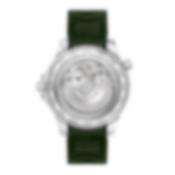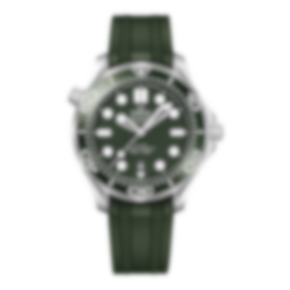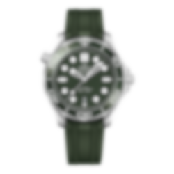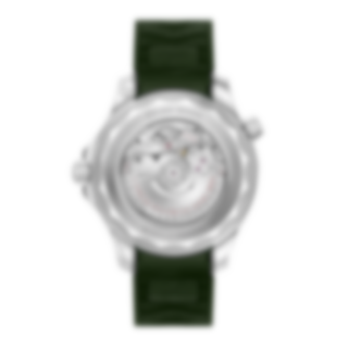 The watch is presented on a green rubber strap and is driven by the OMEGA Master Chronometer Calibre 8800, which can be seen through the sapphire-crystal on the wave-edged caseback.