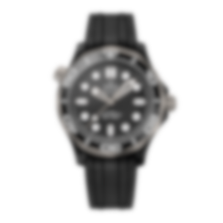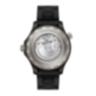 The case of this 43.5 mm model is crafted from black ceramic and grade 5 titanium and includes a black ceramic bezel with a white enamel diving scale. The dial is also brushed black ceramic [ZrO2] and features laser-engraving to create raised waves.