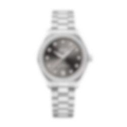 The grey dial is sun-brushed, PVD colour-treated and lacquered, with a circular date window at 6 o’clock. It is highlighted by 11 diamond hour markers and redesigned faceted hands, with the minute hand tapering to a delicate point. All the applied elements and hands are in 18K white gold, while the hands are also filled with white Super-LumiNova which emits a blue glow.