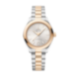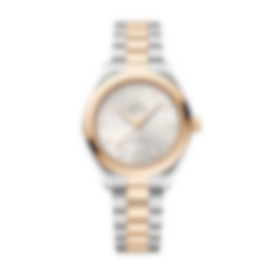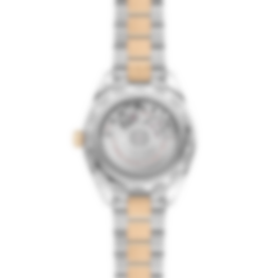 This stainless steel and 18K Moonshine™ Gold model has a symmetrical polished case and features a screw-in caseback with wave-edged design.