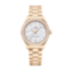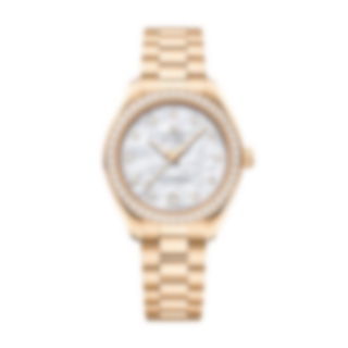 The pearled white mother-of-pearl dial is in full glossy finish, with a circular date window at 6 o’clock. It is highlighted by 11 diamond hour markers and redesigned faceted hands, with the minute hand tapering to a delicate point. All the applied elements are in 18K Moonshine™ Gold, while the hands are crafted in 18K yellow gold with a PVD Moonshine™ Gold coating. The hands also feature white Super-LumiNova which emits a blue glow.