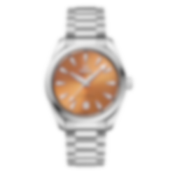 The saffron dial, fashioned from brass, is lacquered and sun-brushed from the centre. There is a date window at 6 o'clock and rhodium-plated hands and indexes filled with white Super-LumiNova.
