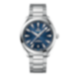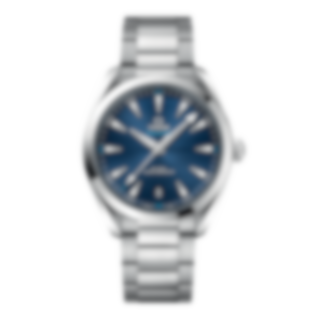 Seamaster Aqua Terra är en hyllning till OMEGAs maritima arv. Denna modell har ett integrerade armband av rostfritt stål. Den blå urtavlan har horisontellt "teak" mönster inspirerat av trädäcken på lyxiga segelbåtar och ett datumfönster klockan 6.