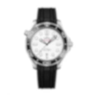This 42 mm model is crafted from stainless steel and includes a black ceramic bezel with a white enamel diving scale. The dial is polished white ceramic and features laser-engraved waves and Seamaster highlighted in red.