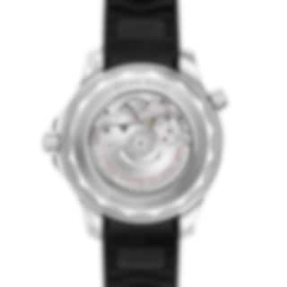 The watch is presented on an intergrated black rubber strap and is driven by the OMEGA Master Chronometer Calibre 8800, which can be seen through the sapphire-crystal on the wave-edged caseback.