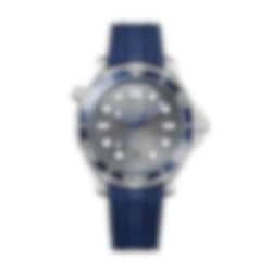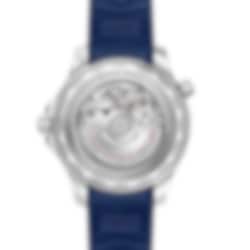 This 42 mm model is crafted from stainless steel and includes a blue ceramic bezel with a white enamel diving scale. The dial is sun-brushed PVD chrome colour ceramic and features laser-engraved waves and a date window at 6 o’clock.