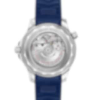 The watch is presented on a blue rubber strap and is driven by the OMEGA Master Chronometer Calibre 8800, which can be seen through the sapphire-crystal on the wave-edged caseback.