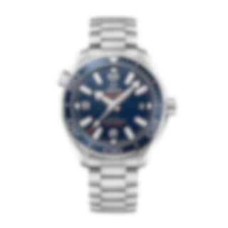 This model, with its scratch-resistant sapphire crystal, features a blue ceramic dial with Arabic numerals and a date window at the 3 o’clock position. The blue ceramic unidirectional bezel with OMEGA Liquidmetal™ diving scale is mounted on a 39.5 mm stainless steel case.