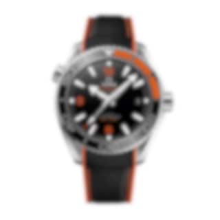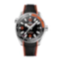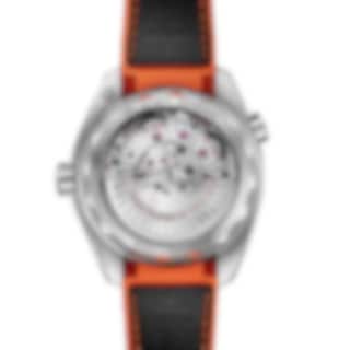 This model, with its scratch-resistant sapphire crystal, features a polished black ceramic dial with Arabic numerals and a date window at the 3 o’clock position. Mounted on the 43.5 mm stainless steel case, is the world's premiere black ceramic bezel with orange rubber. The diving scale of the bezel is crafted with Liquidmetal™.