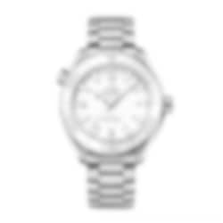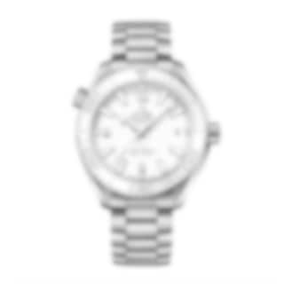 This model, with its scratch-resistant sapphire crystal, features a white ceramic dial with Arabic numerals and a date window at the 3 o’clock position. The white ceramic unidirectional bezel with OMEGA Liquidmetal™ diving scale is mounted on a 39.5 mm stainless steel case.