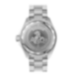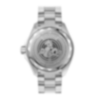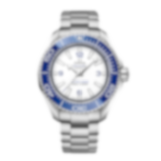 This 45.5 mm model in robust O-MEGASTEEL features a polished blue ceramic bezel with its diving scale in white enamel. Through the protuberant and domed sapphire crystal, the lacquered white dial has been given four Arabic numerals in blue, as well as 18K white gold hands and hour markers, which are all coated with white Super-LumiNova.