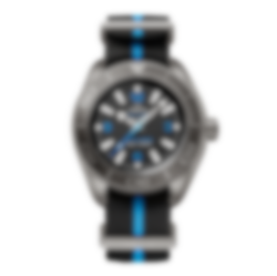 This 45.5 mm model in sand-blasted Grade 5 Titanium features a brushed black ceramic bezel ring with its diving scale in Liquidmetal™. Through the protuberant and domed sapphire crystal, there is a black ceramised Grade 5 titanium dial with a gradient white-to-cyan central seconds hand, cyan Arabic numerals, as well as 18K white gold hour/minute hands and hour markers, which are all coated with white Super-LumiNova.