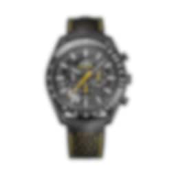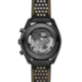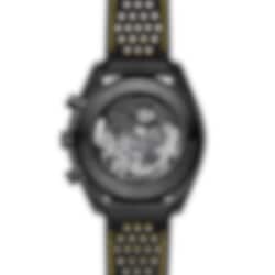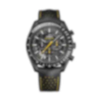 Presented on a perforated black rubber strap with yellow rubber interior, the entire watch is black ceramic and includes a varnished yellow chronograph seconds hands and a laser-engraved tachymeter scale on the bezel which is filled with white enamel. The small-seconds subdial (patent pending) also includes a grade 5 titanium hand shaped like the Saturn V rocket. This 3D shape is obtained by laser turning, while the colours are obtained by white varnish, ablation, and laser blackening.