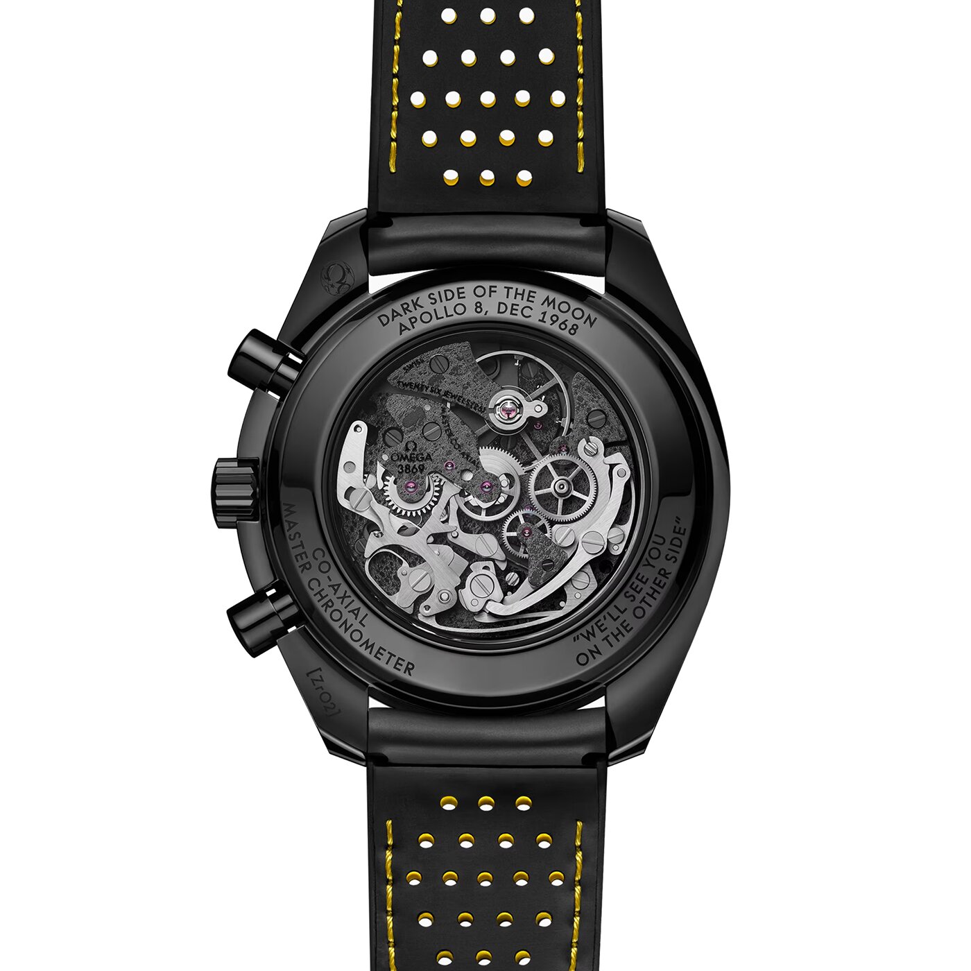 The specially decorated movement is the OMEGA Co-Axial Master Chronometer Calibre 3869, while the engravings on the caseback include “APOLLO 8, DEC 1968”, “DARK SIDE OF THE MOON”, “WE’LL SEE YOU ON THE OTHER SIDE”, and "CO-AXIAL MASTER CHRONOMETER".
