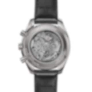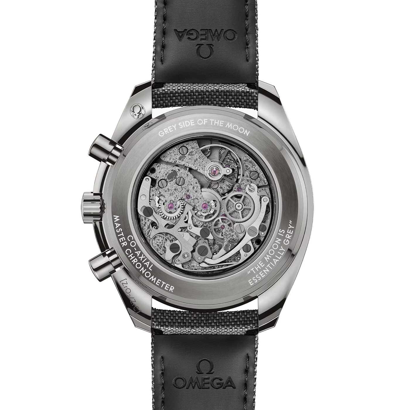 The specially decorated movement is the OMEGA Co-Axial Master Chronometer Calibre 3869, while the engravings on the caseback include the quote, THE MOON IS ESSENTIALLY GREY, which is attributed to Command Module Pilot, Jim Lovell, during the Apollo 8 mission.