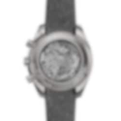 Beneath the front sapphire crystal, OMEGA’s connection to the moon is celebrated via the specially decorated movement, which is laser-ablated on the main plate and bridges to represent the moon’s surface. The near side can be seen on the skeletonized grey anodised aluminium dial, while the far side can be seen through the caseback.