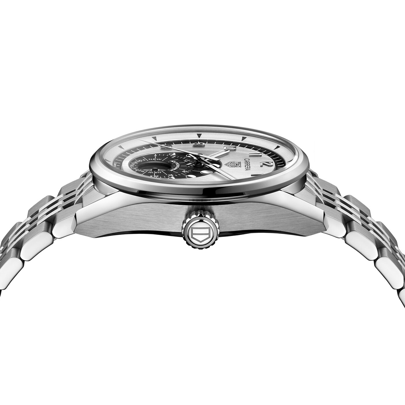 The silver sunray brushed dial, accented with black and silver flanges, exudes timeless elegance. At its center, the 6 o’clock counter features a rotating moon phase disc, showcasing the lunar cycle in intricate detail.