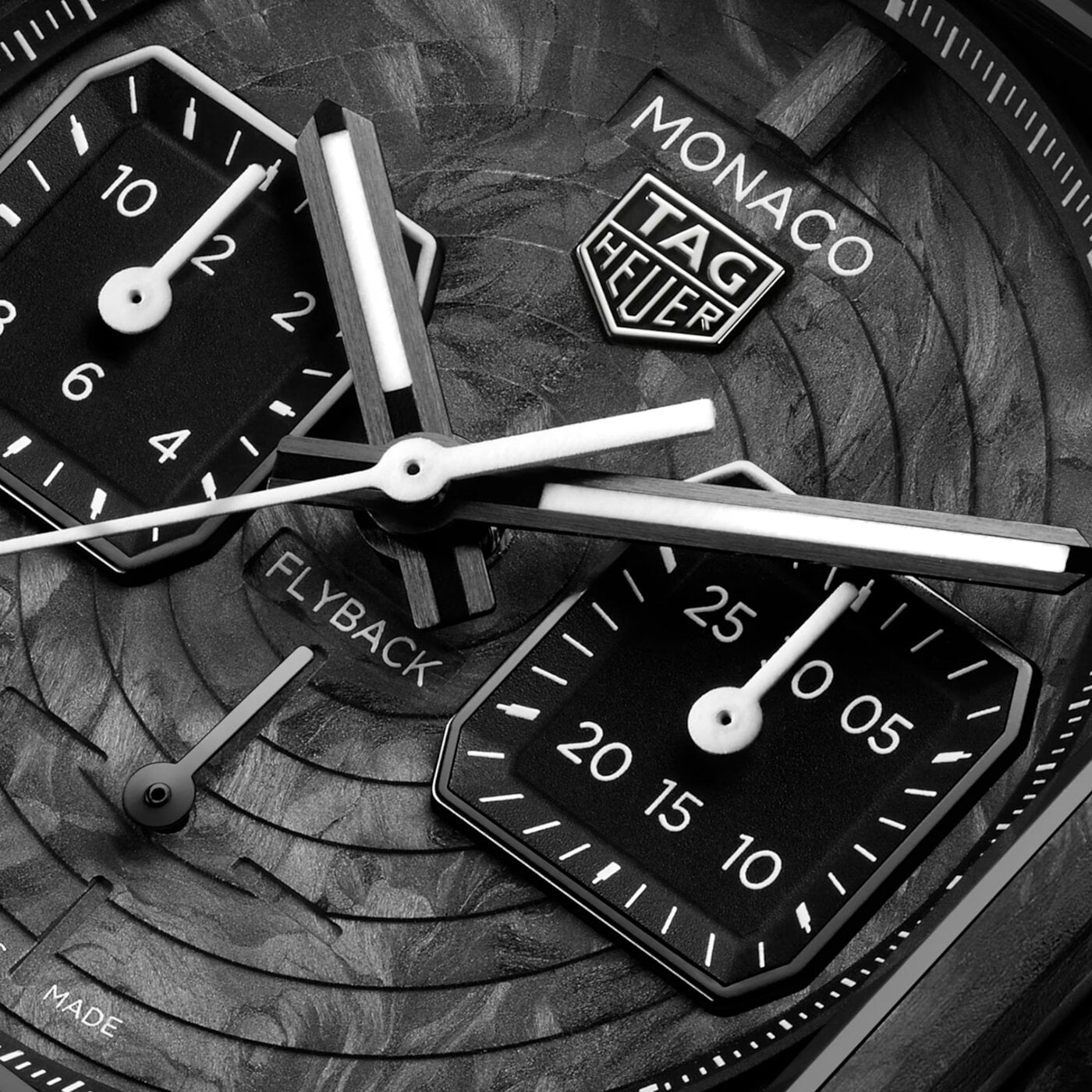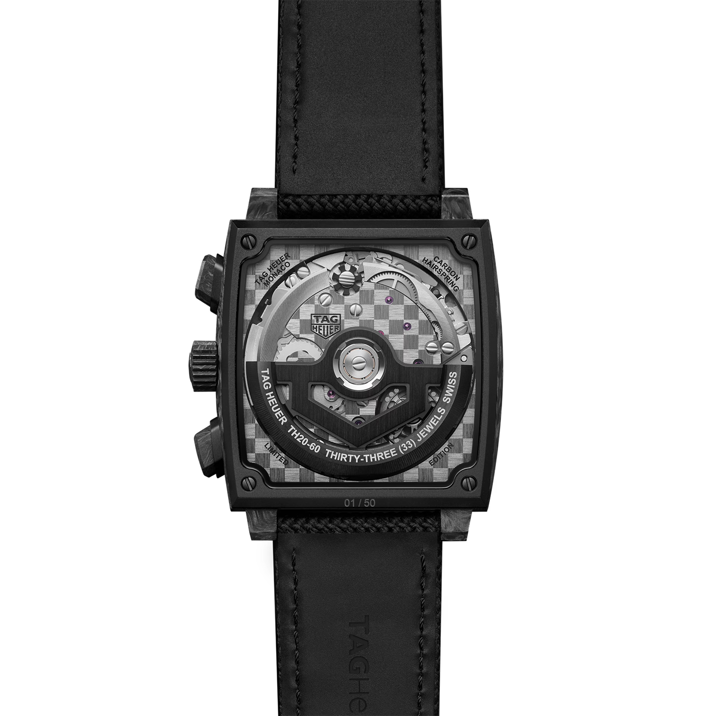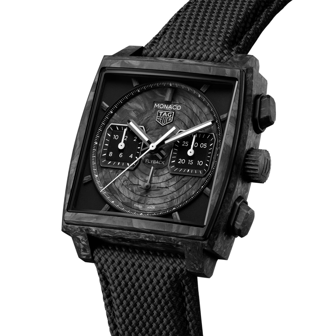 The bold evolution of an icon, the TAG Heuer Monaco Flyback Chronograph TH-Carbonspring honors the invention of the balance spring in 1675— a turning point in watchmaking.