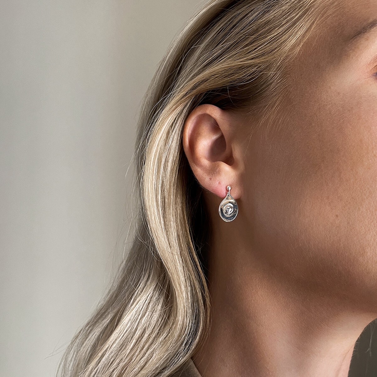 Ett par vackra dinglande örhängen i polerat silver. Örhängena har en elegant droppform och en rund upphöjd detalj i mitten.