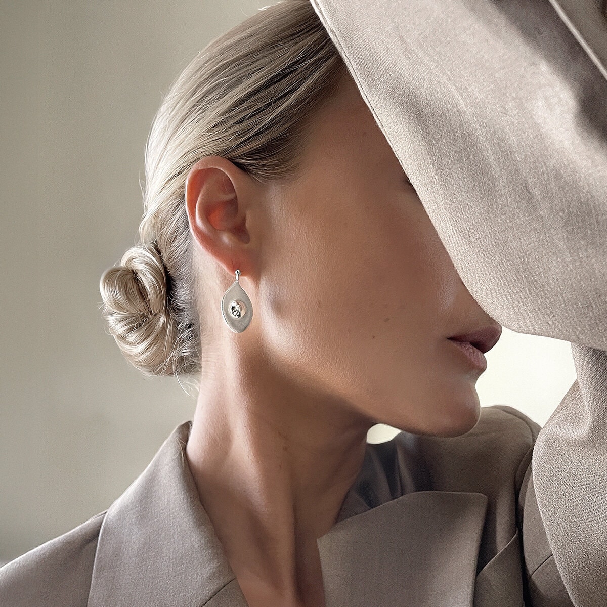 Ett par stora dinglande örhängen i polerat silver som dinglar vackert. Örhängena har en elegant droppform och en rund upphöjd detalj i mitten.