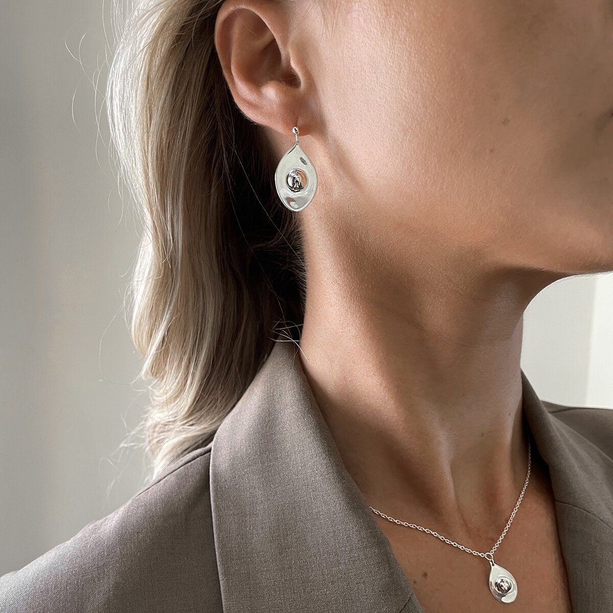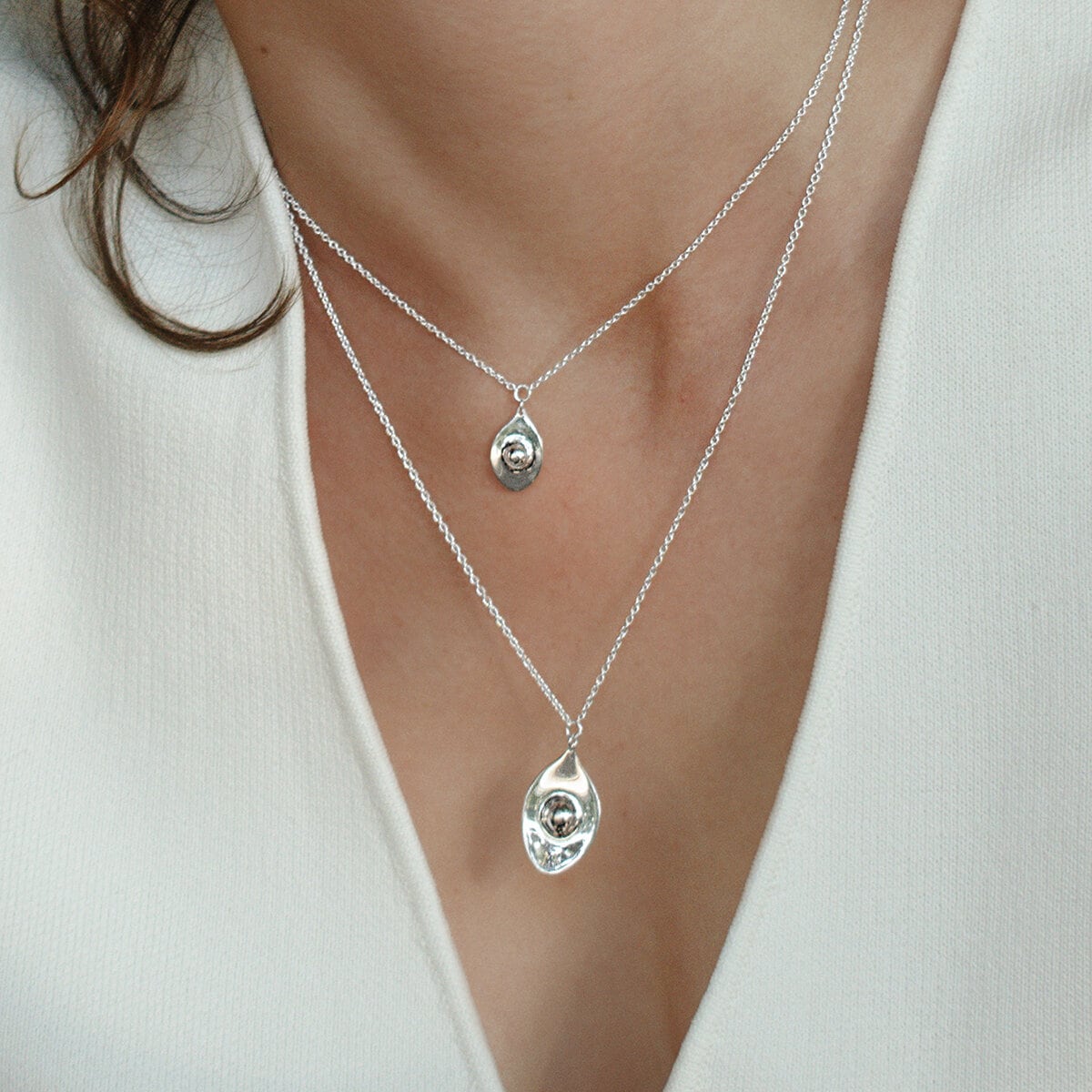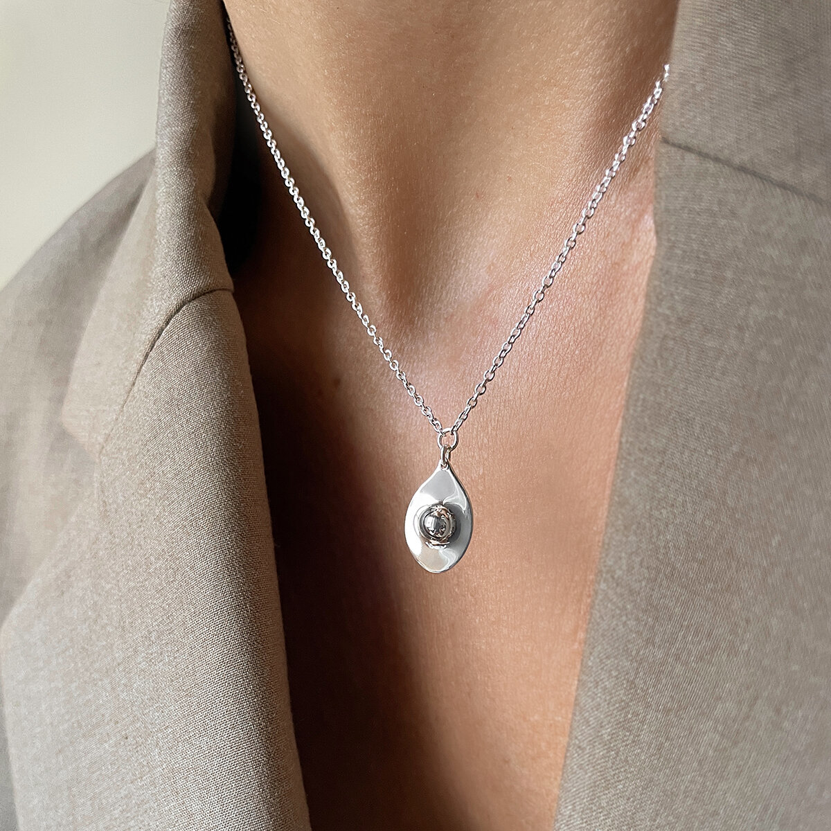 Ett vackert silverhalsband med ett hänge i polerat silver. Hänget / berlocken är droppformad med en rund upphöjd detalj i mitten.
