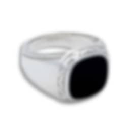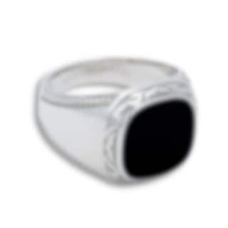En karaktäristisk klackring i 925 sterling silver med sten av svart onyx som definitivt fångar blickar. Ringen har detaljrika mönster runt stenen samt längs sidan av ringen. Ringen är det perfekta smycket att bära som "statement pice" men fungerar minst lika bra tillsammans med flera ringar på samma hand.