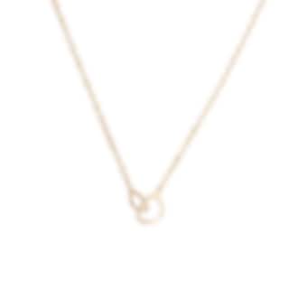 Ett kort guldhalsband på tunn kedja med två stycken små former som sitter ihop tillsammans i en vacker organiskt design. Den ena är i skimrande borstat guld och den andra i blank högpolerad guld.