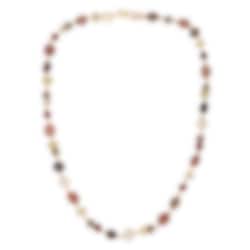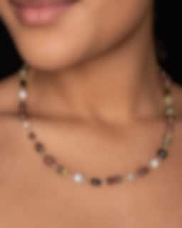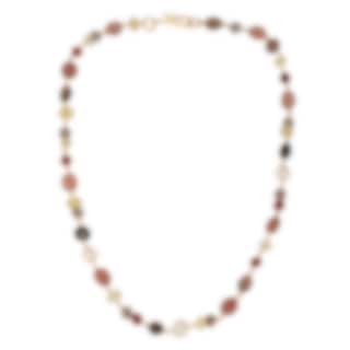 Sienna Piccolo-halsbandet är komponerat i en varm färgpalett av prehnit, rökkvarts, röd kvarts, hessonitgranat, labradorit, citronkvarts och lysande Akoya-pärlor. De naturliga ädelstenarna följer halsens siluett i en glödande komposition av jordtoner med eleganta, dämpade kontraster.
