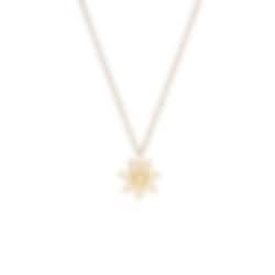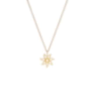 Skapat i 18 karats guld är hänget format av vågiga solstrålar som samlas i ett spiralmönster – en stillsam referens till oändlighet och kontinuitet.