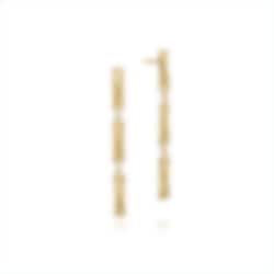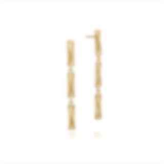 De långa Vega Relief-örhängena har tre rörliga leder, vars små rörelser och ytor fångar upp ljuset och skickar det vidare mot ansiktet och halsen som badar i ett gyllene ljus.