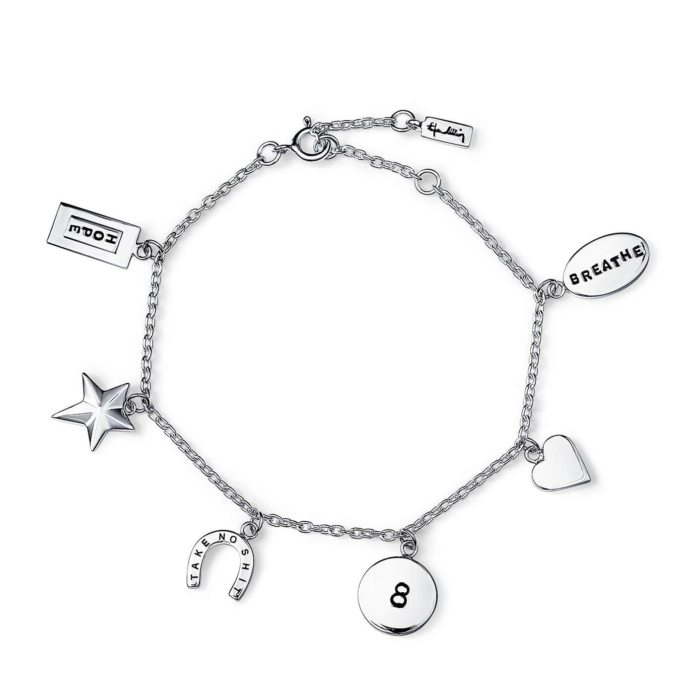 Armband i återvunnet sterlingsilver med sex berlocker inspirerat från andra kollektioner av Efva. Berlockernna består av ett hjärta, Baby luck- en bricka med en 8, Take no shit- en hästsko med texten ”Take no shit”, Catch a falling star - en stjärna, Hope - en stansad platta med ordet ”Hope” och Breathe- en oval platta stansad med ”Breath”.