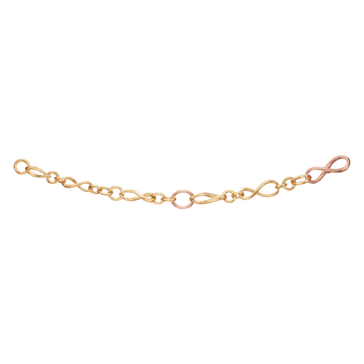 Detta Love-armband, designat av Charlotte Lynggaard, är tillverkat i 18 karats gult och roséguld. Armbandet är 20 cm långt och har individuella länkar i varierande storlekar. Guldsmedsmästare har handsatinborstat guldytorna. Det är en del av Love Collection.