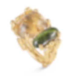 BoHo Ring i guld med en Rutilkvarts samt en grön Turmalin och 5st diamanter.