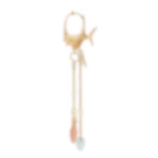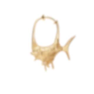 Designad av Sofia Lynggaard Normann. Dessa Young Fish-örhängen är tillverkade av 18 karat gult guld. Ytan på guldet är satinerad och polerad för hand. Varje örhänge är designad med fyra ögon vardera så att du kan lägga till en mängd olika föränderliga hängen och därigenom skapa en mängd olika föränderliga uttryck.
