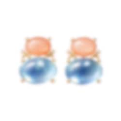Små stiftörhängen i 18 karats gult guld med rosa månstenar, ljusblå akvamariner och små diamanter. Varje örhänge har en liten ögla för berlocker. Observera att naturstenarna varierar i färg och utseende, vilket gör varje par unikt. Bilderna är exempel och visar inte exakt hur stenarna i ditt par kommer att se ut.
