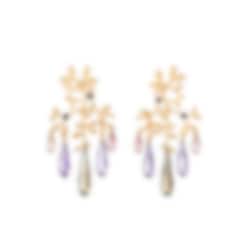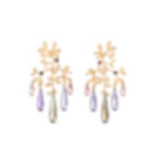 Dessa Gipsy örhängen i mediumstorlek är formgivna av Charlotte Lynggaard och tillhör den bohemiskt lyxiga Gipsy-kollektionen. De är tillverkade i 18 karat gult guld och prydda med en rik och harmonisk kombination av ädelstenar, rökkvarts, ametister, persiko turmaliner och blush månsten. Sex briljantslipade diamanter med en total vikt på 0,06 ct ger örhängena en subtil glans och förhöjer deras exklusiva uttryck.