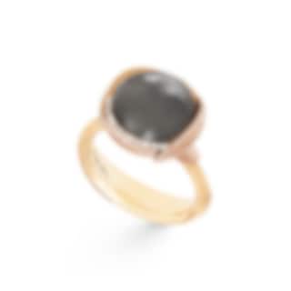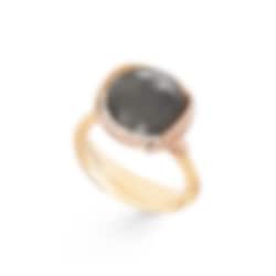 Ring Lotus i rödguld med roséguldsblad och cabochonslipad grå månsten. Ett band med diamater pryder ena sidan om stenen.