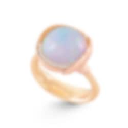 Designad av Charlotte Lynggaard, denna Lotus-ring, storlek 3, är tillverkad i 18 karat gult och roséguld och smyckad med 13 diamanter med en total vikt på 0,05ct. Samt en cabochonslipad opal.