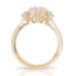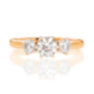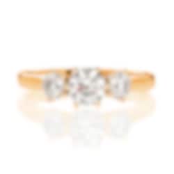 Med fyraklosfattningar som ger ljus för de tre vackra diamanterna. Två mindre diamanter på mittstenen som både klär och stärker sidorna på fattningen.